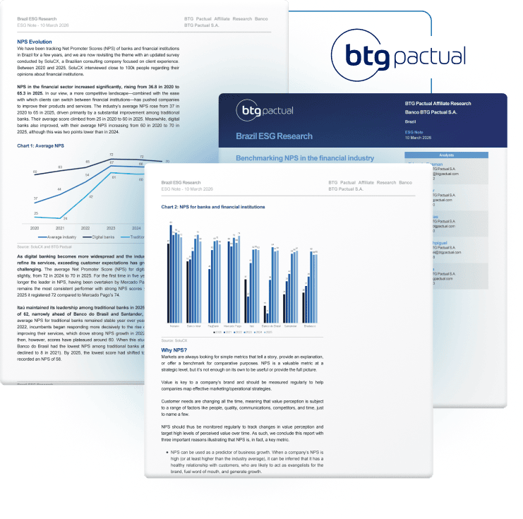 A SoluCX em parceria com o BTG Pactual revisita um dos principais indicadores de experiência do cliente no setor financeiro.Há alguns anos, o banco acompanhou o NPS de bancos e instituições financeiras no Brasil. Agora, o tema ganha uma nova análise com dados atualizados da SoluCX.Entre 2020 e 2025, a SoluCX realizou cerca de 100 mil entrevistas com consumidores em todo o país, trazendo uma visão aprofundada sobre percepção, satisfação e lealdade no setor financeiro.Um material essencial para entender como a experiência do cliente impacta resultados e competitividade no mercado financeiro.